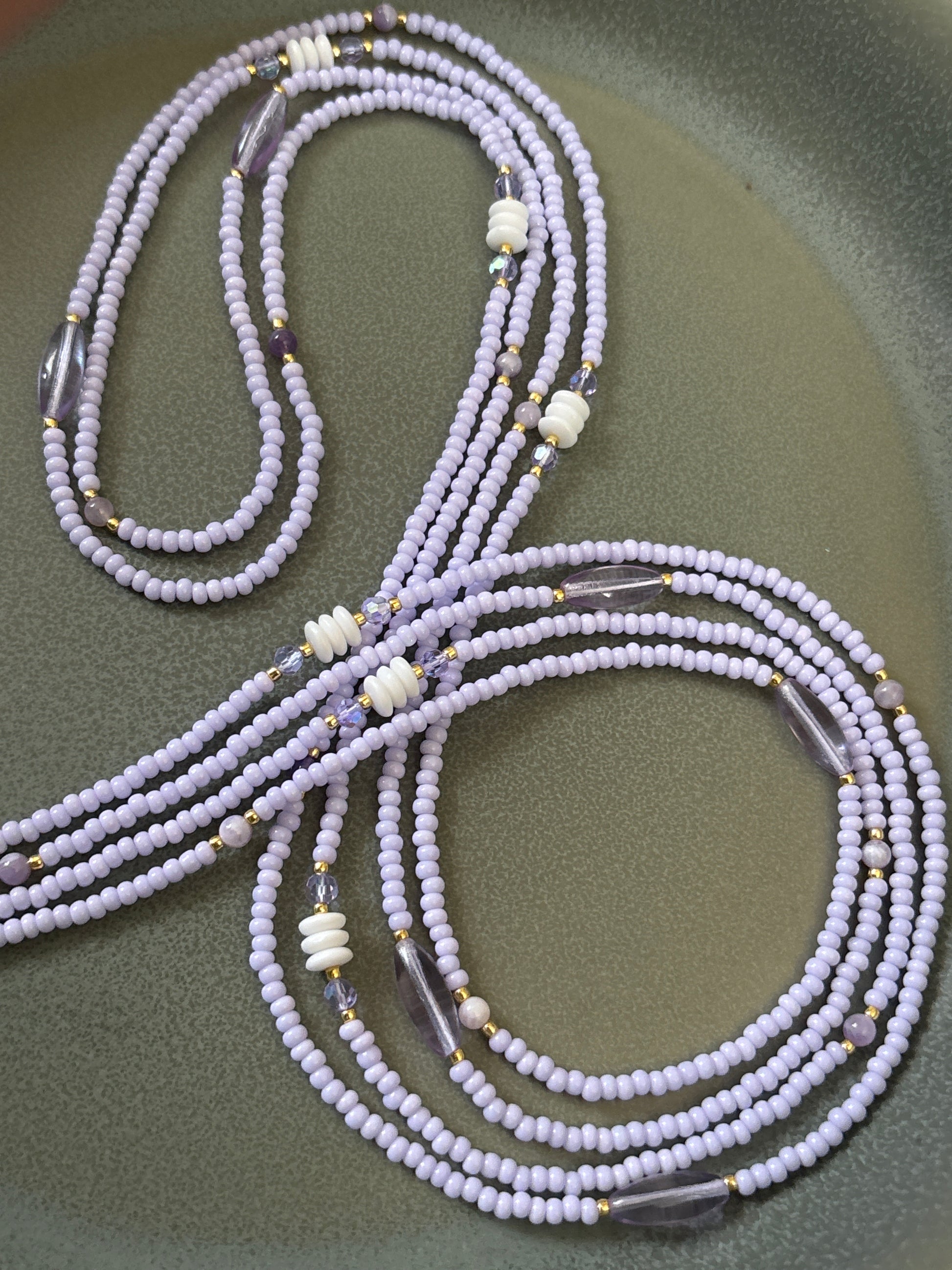 Standard 55" tie on waist bead, for larger size leave a note at checkout. Up to 65" at no additional charge.